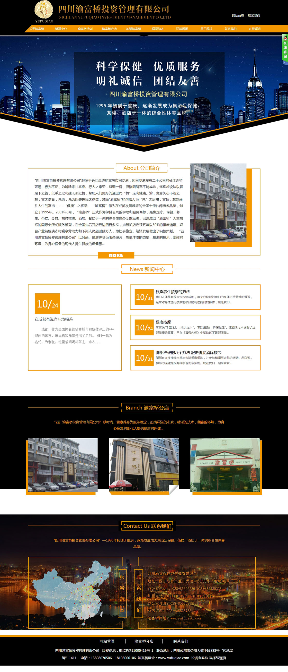 “渝富桥”作为在成都发展起来的全国十佳休闲商务品牌,创立于1995年。2001年3月,“渝富桥”正式作为保健公司的字号和服务商标,是集足疗、保健、养生、茶楼、会务、商务棋牌、酒店、餐饮于一体的综合性商务会馆品牌,已建成以“渝富桥”为主商标的国际会所式服务模型,在全国先后开店已达四百多家,加盟扩店连续五年以30%的幅度递增。项目产业链解决农村剩余劳动力和下岗人员超过肆万人,为社会稳定、经济发展做出了积极贡献。