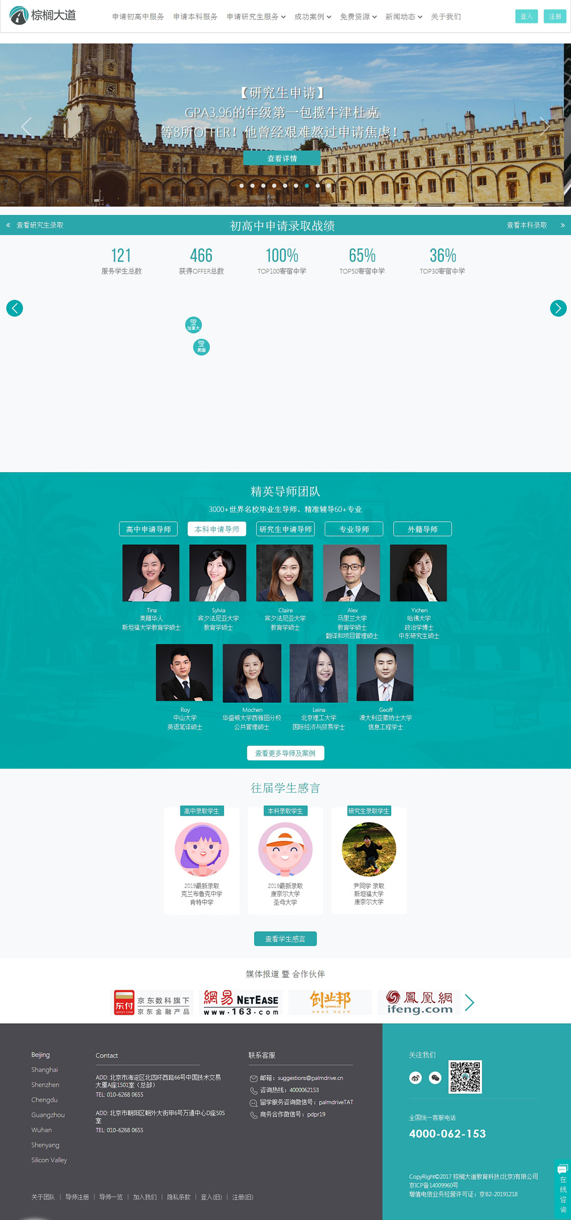 棕榈大道拥有4000+的导师,遍布北美和欧洲,90%以上导师来自世界排名TOP30的学校。我们通过知名学府和各行业的精英导师来打破国内外教育信息资源不对称。为家长和同学们提供一个可靠的留学资讯平台。为同学们提供一对一学业规划、留学申请指导、海外文化融入、职业规划的服务。