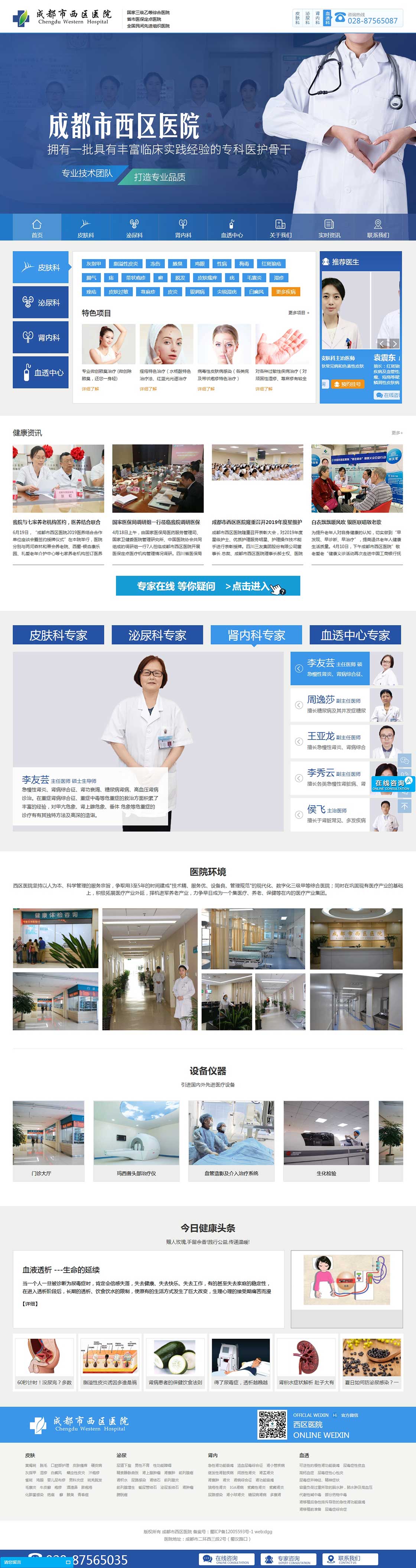 成都市西区医院成立于1999年。建院十多年来,医院始终坚持规范化办院方针,秉承“救死扶伤,以呵护人类健康为己任”的理念,积极致力于医疗卫生事业的发展,以技术精湛的专家队伍,先进一流的医疗设备,良好舒适的就医环境,方便快捷的医疗流程,保证了高质量的诊疗水平,得到了政府及社会各界的广泛支持和认同。